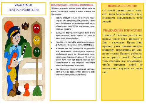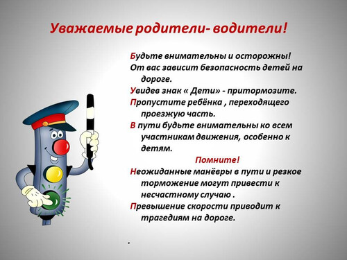 Поэтому, следует своевременно научить детей умению ориентироваться в дорожной ситуации, воспитывать потребность быть дисциплинированными на улице, осторожными и осмотрительными. А родителям - не совершать самую распространенную ошибку – действия по принципу «со мной можно». Если Вы показываете ребенку на собственном примере, как перебежать на красный, будьте уверены, оставшись один, он попытается повторить то же самое. Уважаемые родители! Помните, если Вы нарушаете Правила, ваш ребенок будет поступать так же! В наших силах сформировать навыки безопасного поведения на дорогах, воспитать сознательного и грамотного пешехода, ответственного за жизнь и здоровье участников дорожного движения.