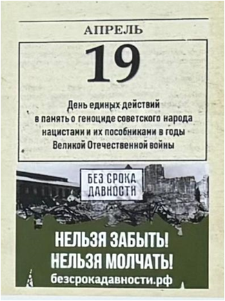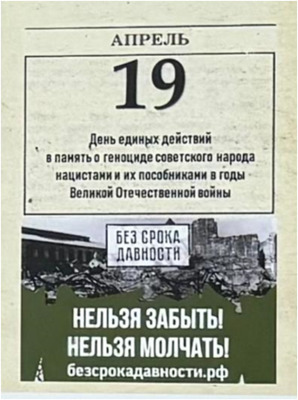 19 апреля – особая дата в сохранении исторической правды о преступлениях нацистов. В этот день в 1943 году был издан Указ Президиума Верховного Совета СССР № 39 «О мерах наказания для немецко-фашистских злодеев, виновных в убийствах и истязаниях советского гражданского населения и пленных красноармейцев, для шпионов, изменников родины из числа советских граждан и для их пособников». Появление этого документа было первым фактом признания целенаправленной и масштабной политики нацистов и их пособников по уничтожению мирного населения на оккупированной территории и наказуемости таких преступлений. Этот Указ Президиума Верховного Совета СССР стал правовым основанием большой работы по установлению и расследованию преступлений нацистов против советского народа, которая велась с ноября 1942 г. Чрезвычайной государственной комиссией по установлению и расследованию злодеяний немецко-фашистских захватчиков.