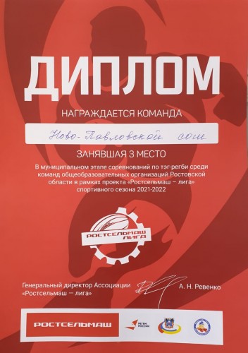 Команда Ново-Павловской СОШ приняла участие в муниципальном этапе соревнований по тэг-регби среди команд общеобразовательных организаций Ростовской области в рамках проекта " Ростсельмаш-лига " спортивного сезона 2021 -2022 и заняла 3 место.