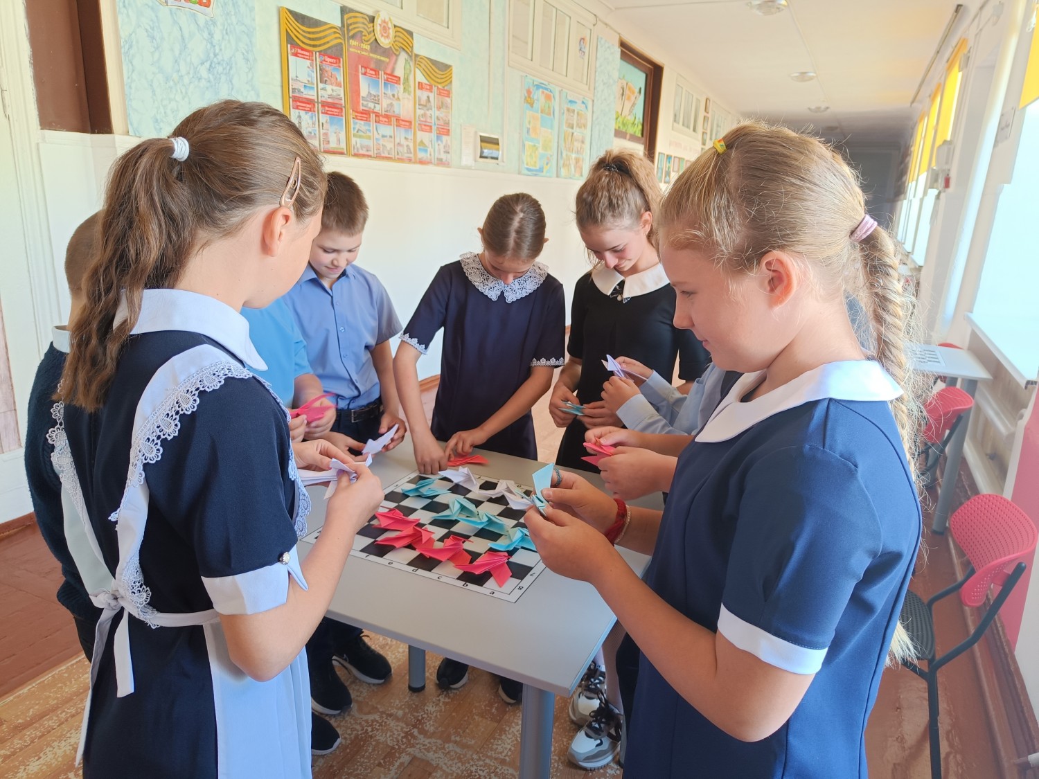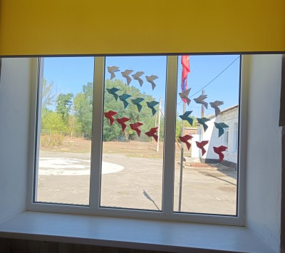 Обучающиеся 5 класса приняли участие в акции "Голубь мира". Они изготовили своими руками голубя в технике оригами из бумаги цветов, образующих российский флаг: белого, синего и красного, и украсили голубями окно в зоне коворкинга центра «Точка роста».