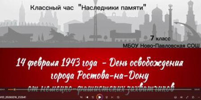 В 7 классе прошел классный час "Наследники памяти", посвященный Дню освобождения Ростова -на -Дону от фашистских захватчиков, целью которого было показать героизм наших воинов во время Великой Отечественной войны, стойкость и мужество людей, оказавшихся в оккупации, воспитать любовь и уважение к своей малой Родине.
