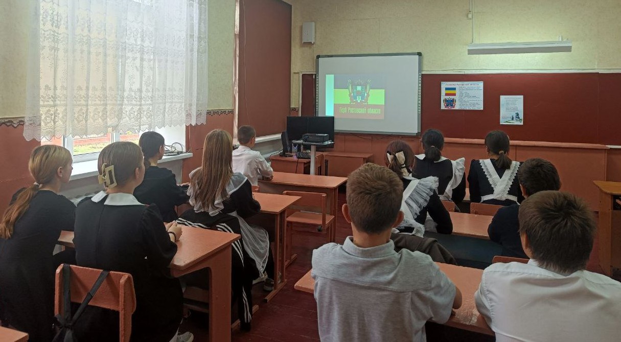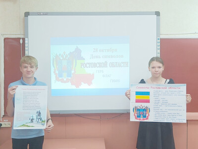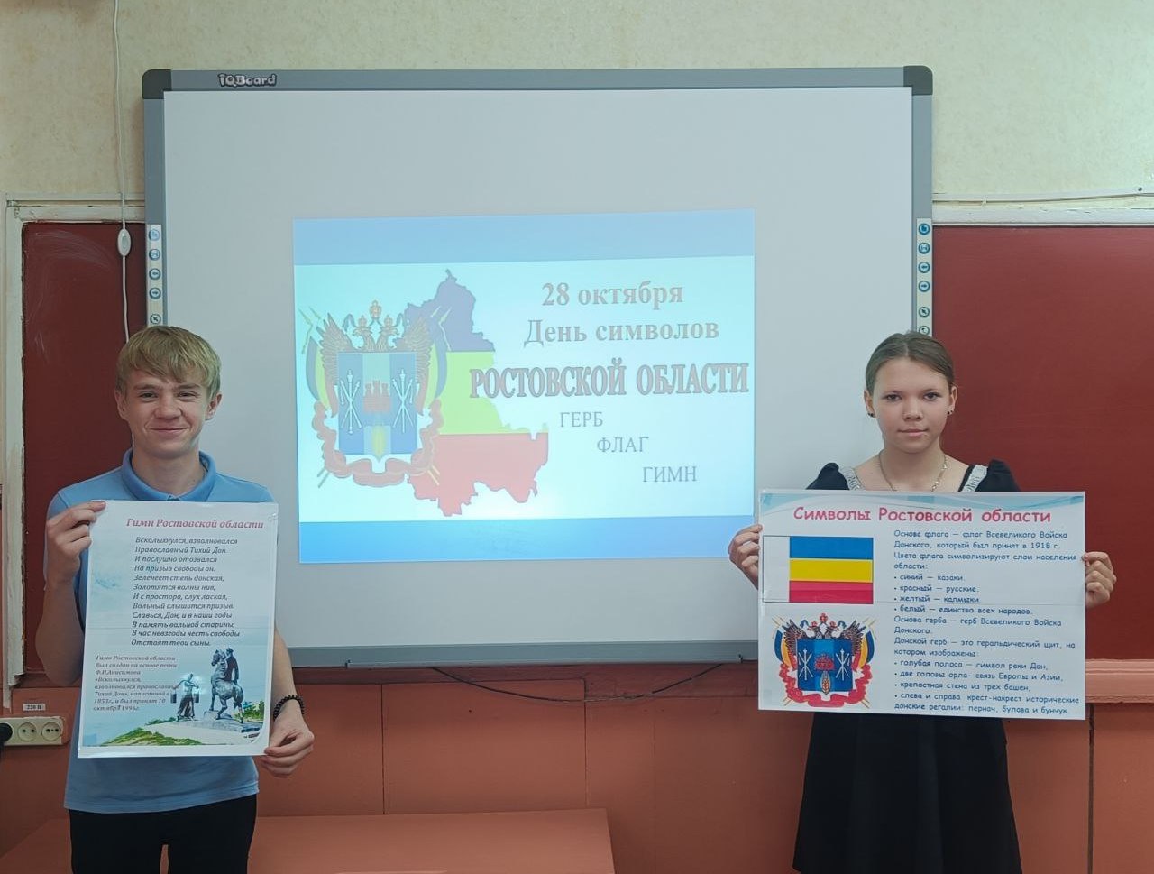 28 октября - День символов донского региона: герба, флага и гимна. К этой дате советник директора по воспитанию Кремнева Алла Николаевна провела в 8, 9 классах классный час «Символы Ростовской области: прошлое и настоящее».