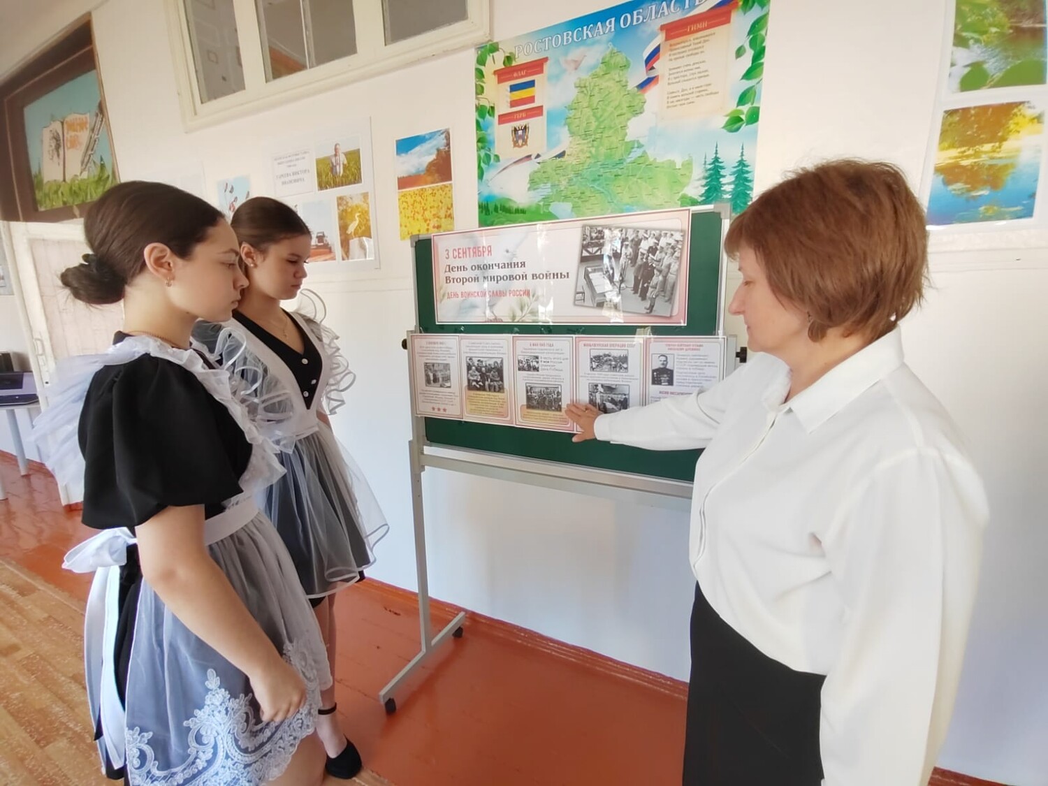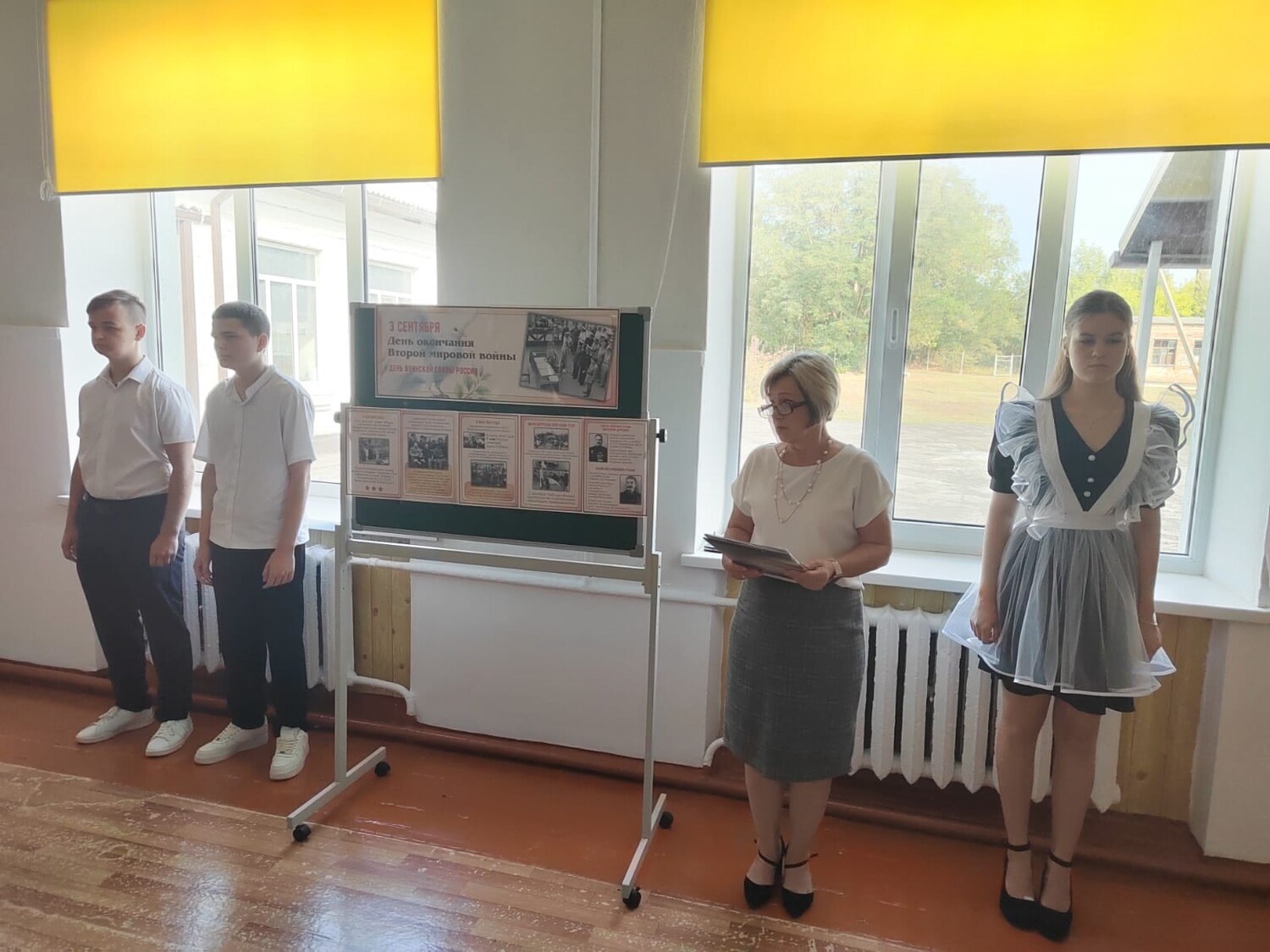 В рамках партийного проекта «Историческая память» в Ново-Павловской школе прошла линейка «День Победы над милитаристской Японией и окончания Второй мировой войны». На линейке советник директора по воспитанию Кремнева Алла Николаевна и заместитель директора по воспитательной работе Черенкова Валентина Анатольевна рассказали о том, что окончание Второй мировой войны – это великое событие для всего мира. Именно в этот день был побежден нацизм и фашизм, прекращено преступление против всего человечества. Ключевую роль в этой победе сыграл Советский Союз и его храбрые воины: они сражались не только за свою Родину. Советские солдаты гнали врага до самого Берлина, изгоняя его с территорий других государств, захваченных нацистской Германией и ее союзниками.