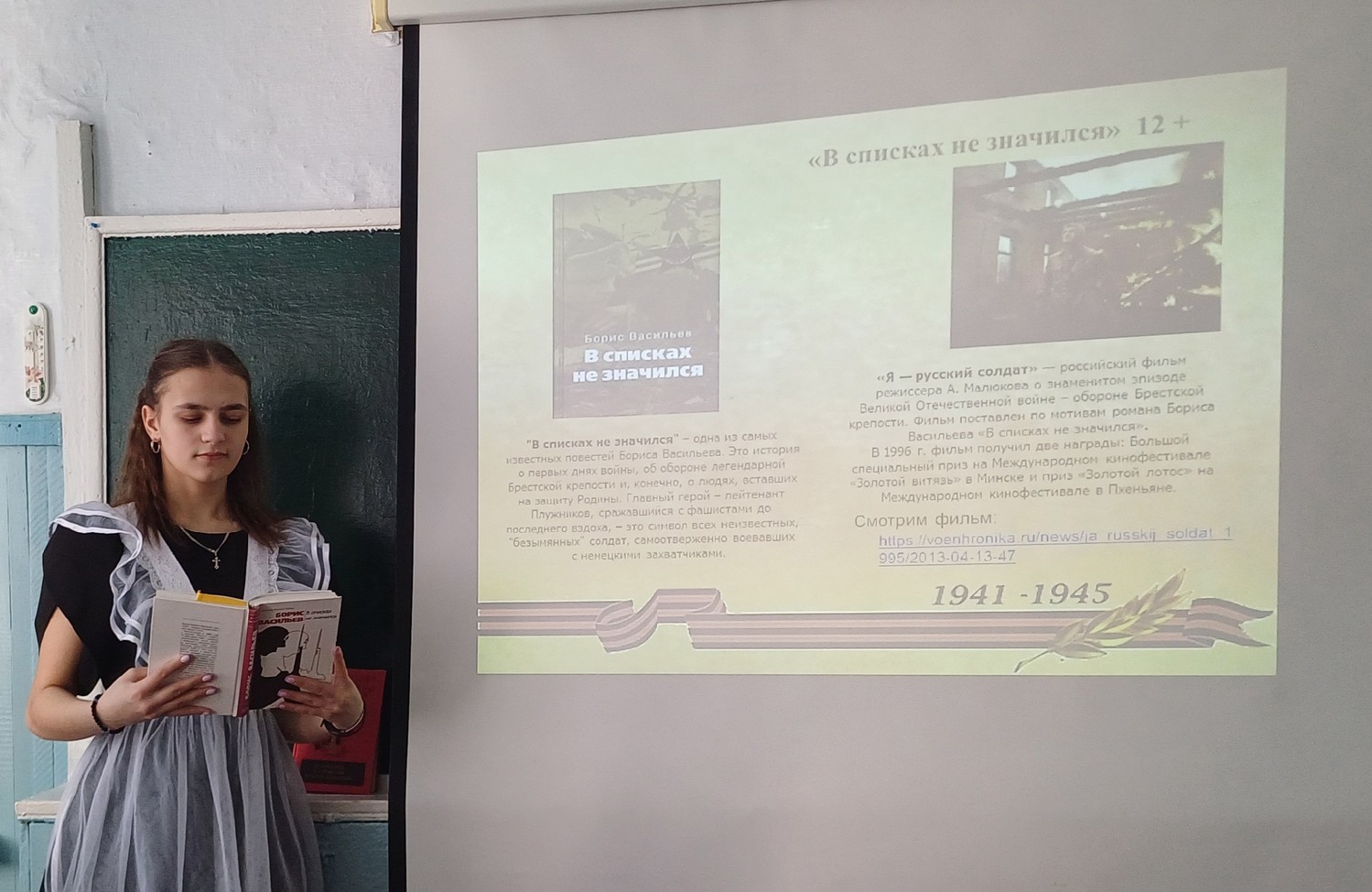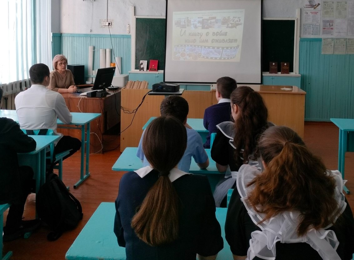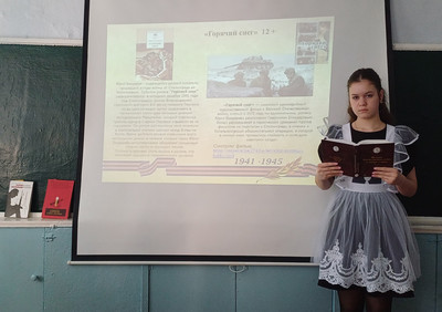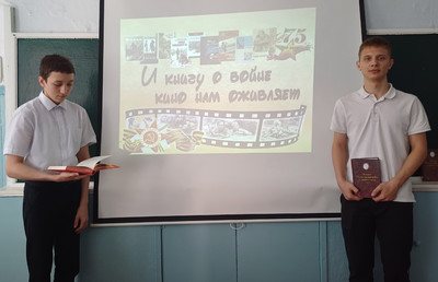 В рамках Всероссийской недели детской книги - 2025 «История с продолжением», посвященной 80-летию Победы в Великой Отечественной войне и Году защитника Отечества для учеников 9 класса проведено мероприятие «И книгу о войне кино нам оживляет" с последующим просмотром и обсуждением фильма "Я -русский". Отечественный фильм снят по повести Б. Васильева "В списках не значился". Это история о первых днях войны, об обороне легендарной Брестской крепости и о людях, вставших на защиту Родины. Главный герой – лейтенант Плужников, сражавшийся с фашистами до последнего вздоха, – это символ всех неизвестных, "безымянных" солдат, самоотверженно воевавших с немецкими захватчиками.
