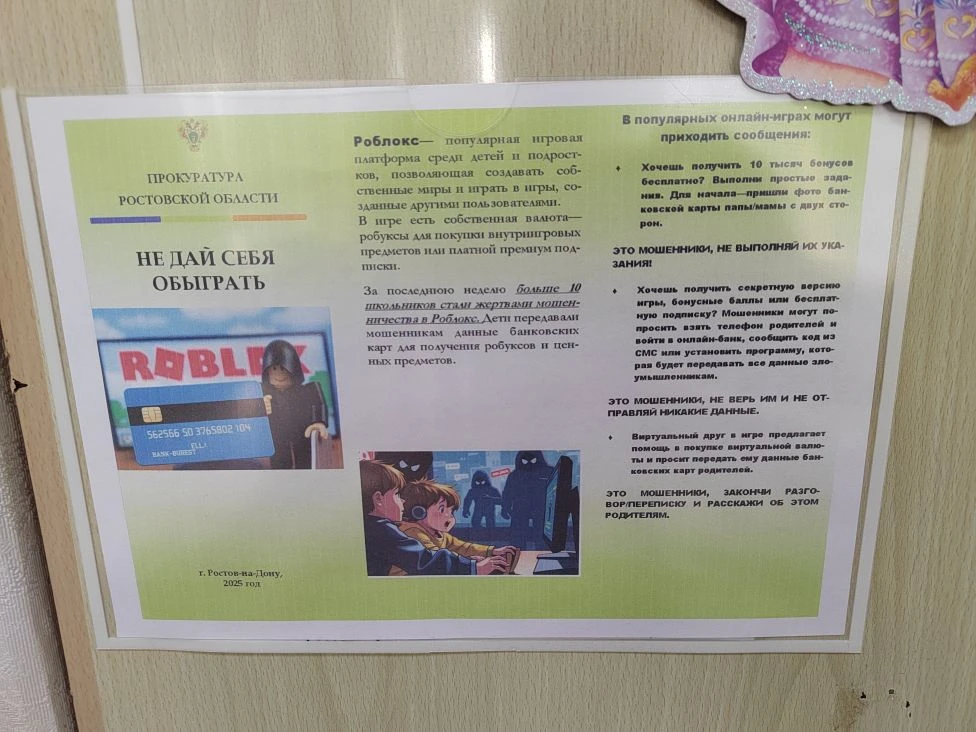 В классных уголках размещены памятки, содержащие полезные советы о том, как защитить себя от мошенников в игре Роблокс и других онлайн-платформах.