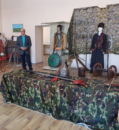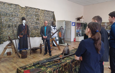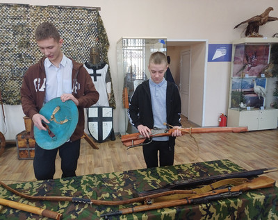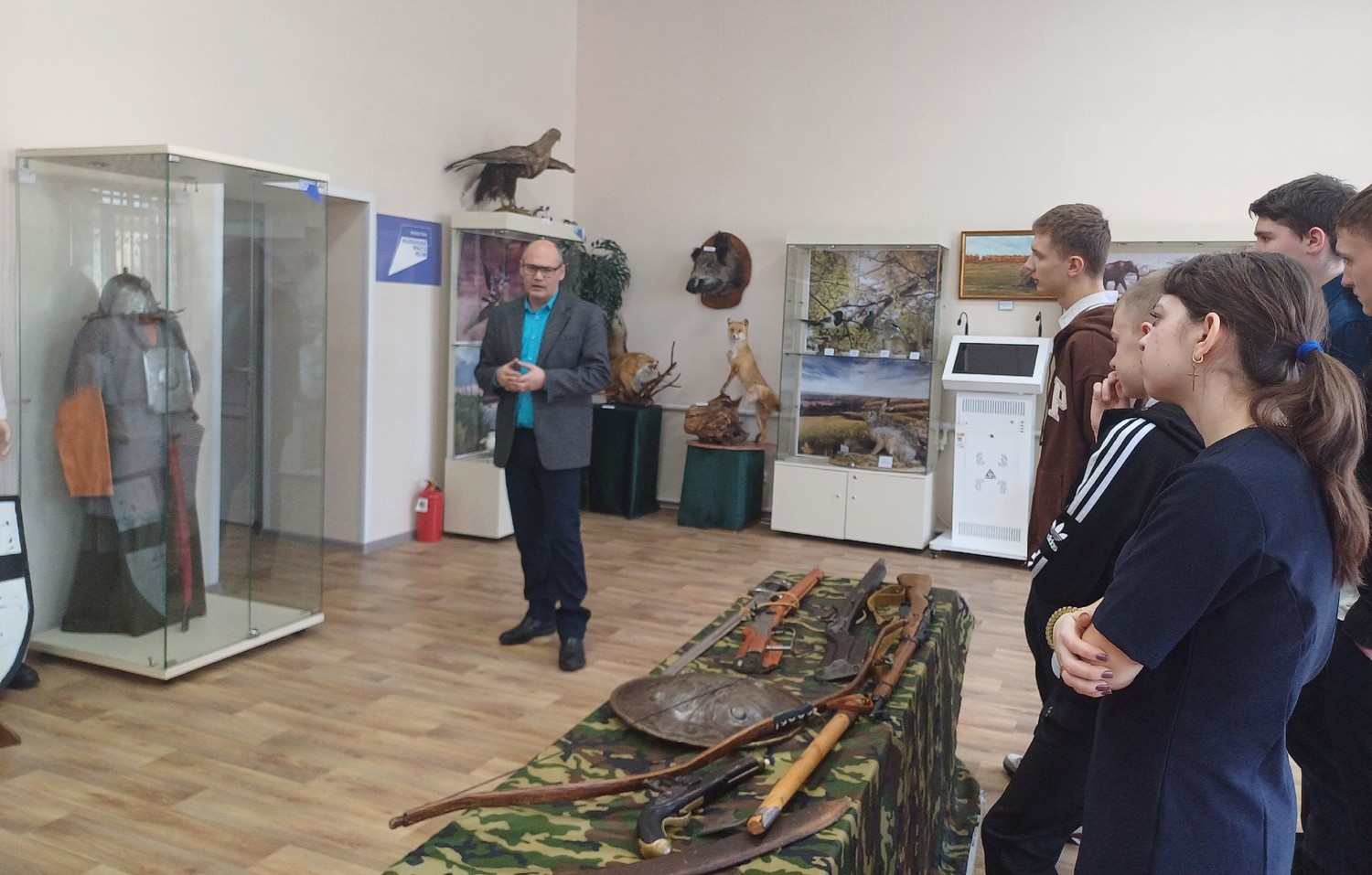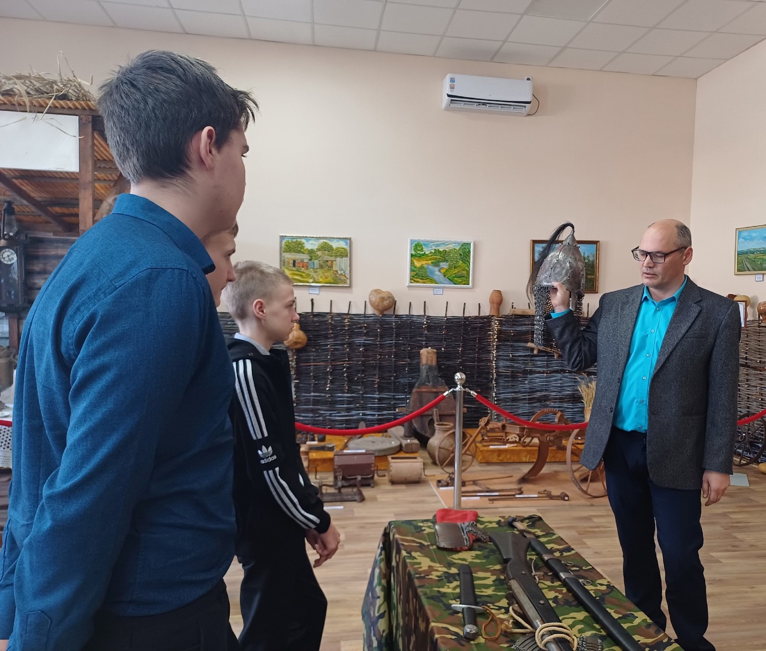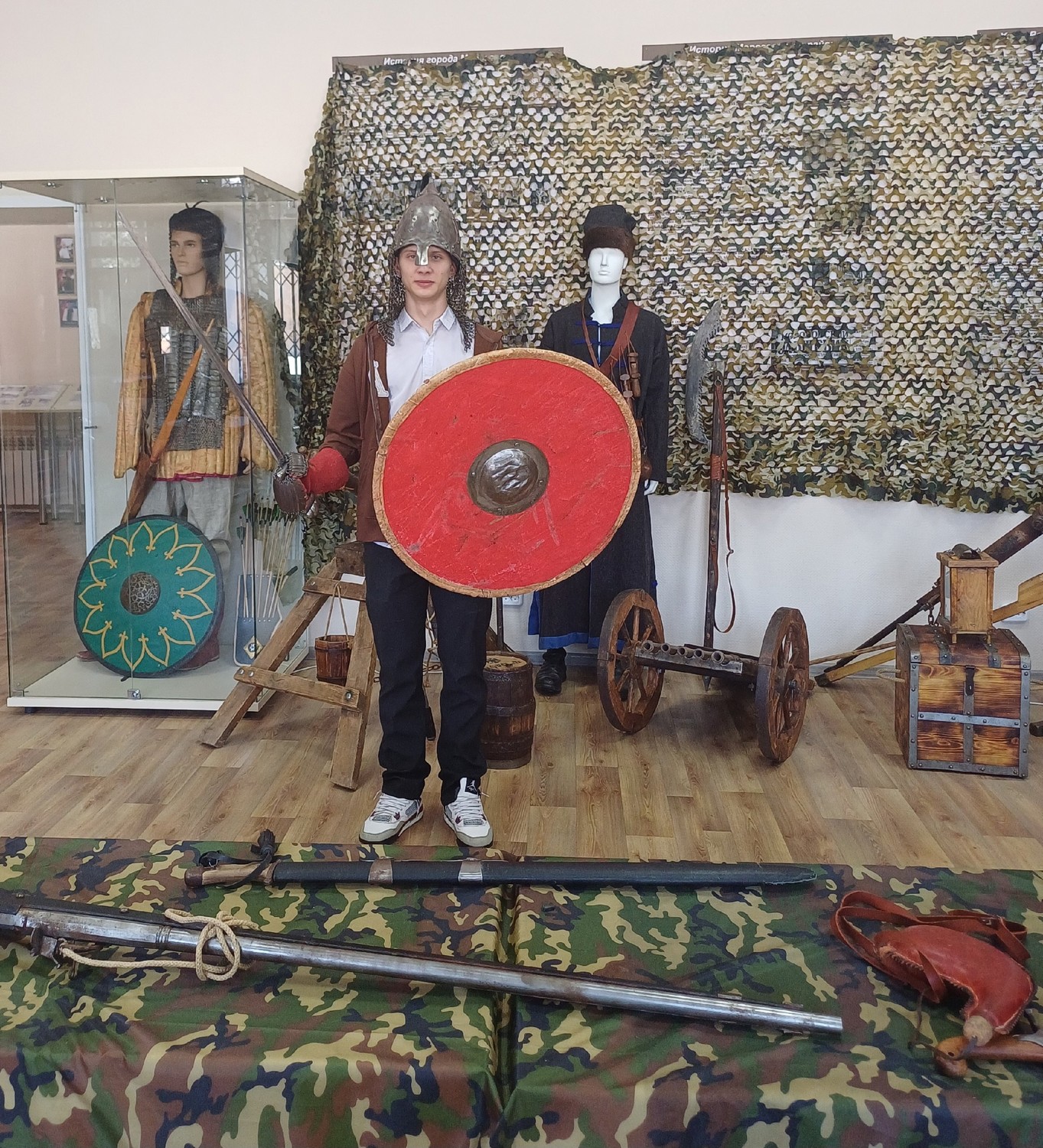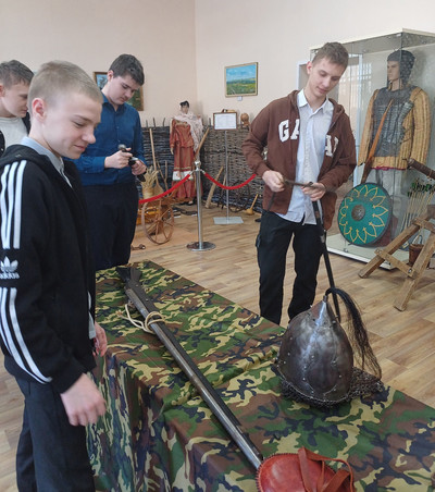 Во время урока руководитель музея Украйченко Павел Иванович рассказал ребятам о военной форме и атрибутике русских воинов X - XVII веков.