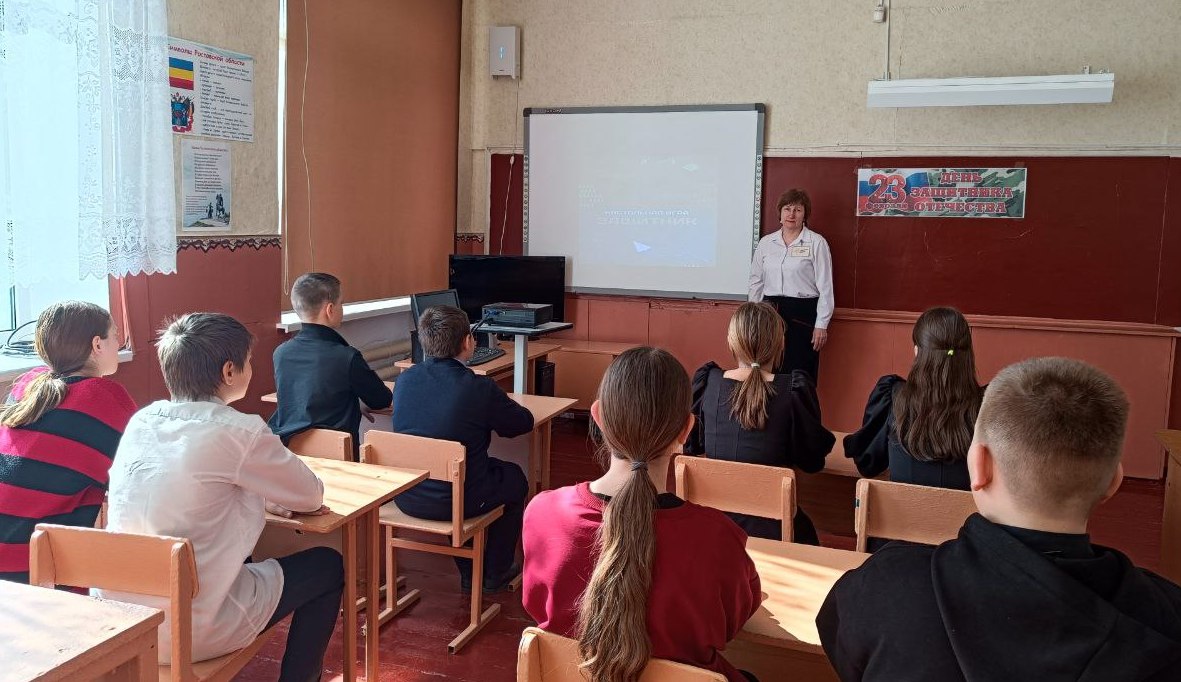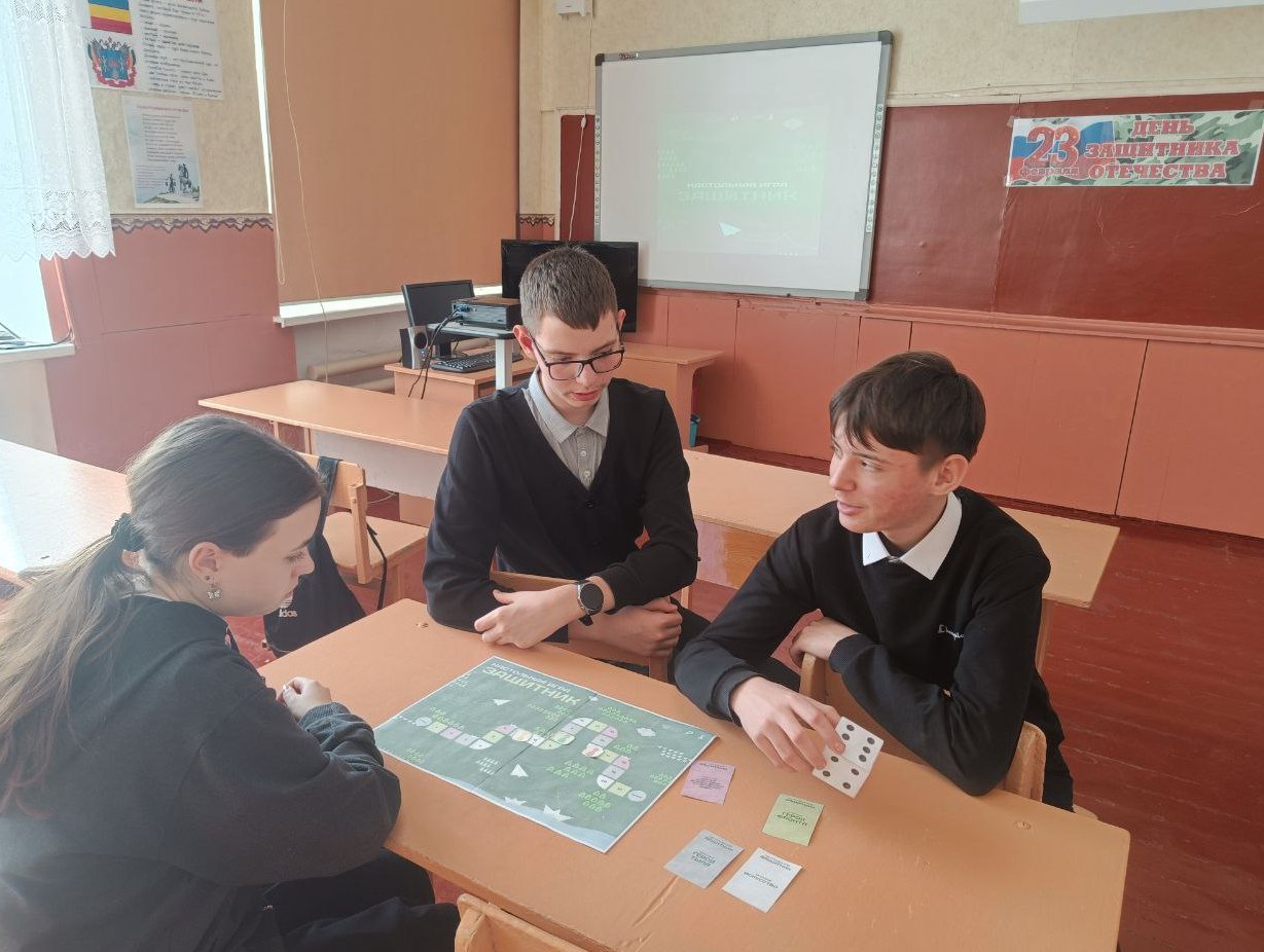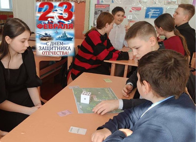В преддверии Дня защитника Отечества советник директора по воспитанию Кремнева А. Н. провела настольную игру «Защитник» с учениками 7 и 8 классов. В рамках игры участники узнали о деятелях тыла, образования, искусства в годы Великой Отечественной войны.