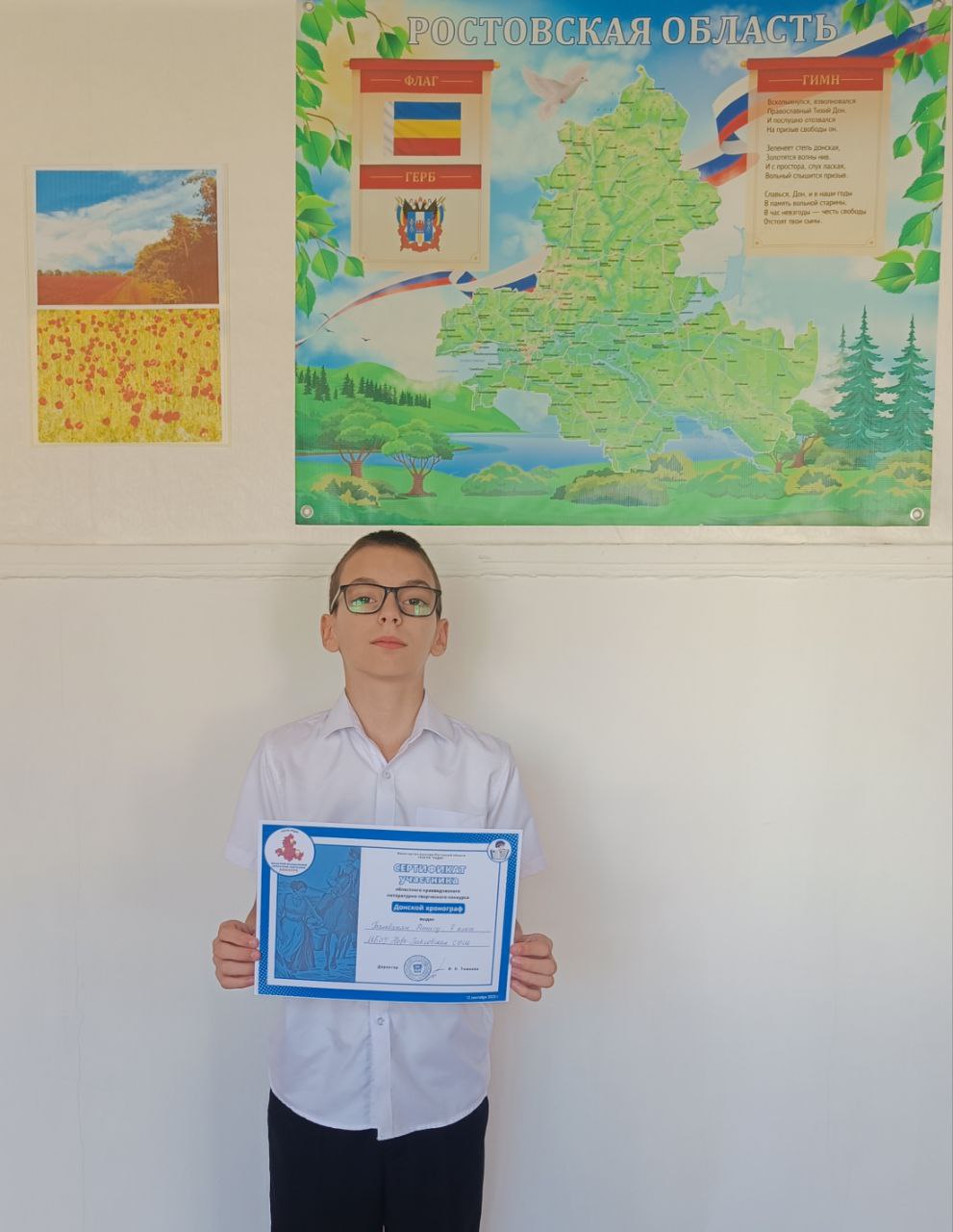 Балабанян Денис, ученик 7 класса, стал участником ежегодного областного краеведческого литературно-творческого конкурса «Донской хронограф», посвящённого 120-летию со дня рождения Михаила Александровича Шолохова и 455-летию служения донских казаков Российскому государству, в номинации «Путешествие в шолоховский мир». Денис нарисовал иллюстрацию к произведению Михаила Александровича Шолохова «Нахалёнок».
