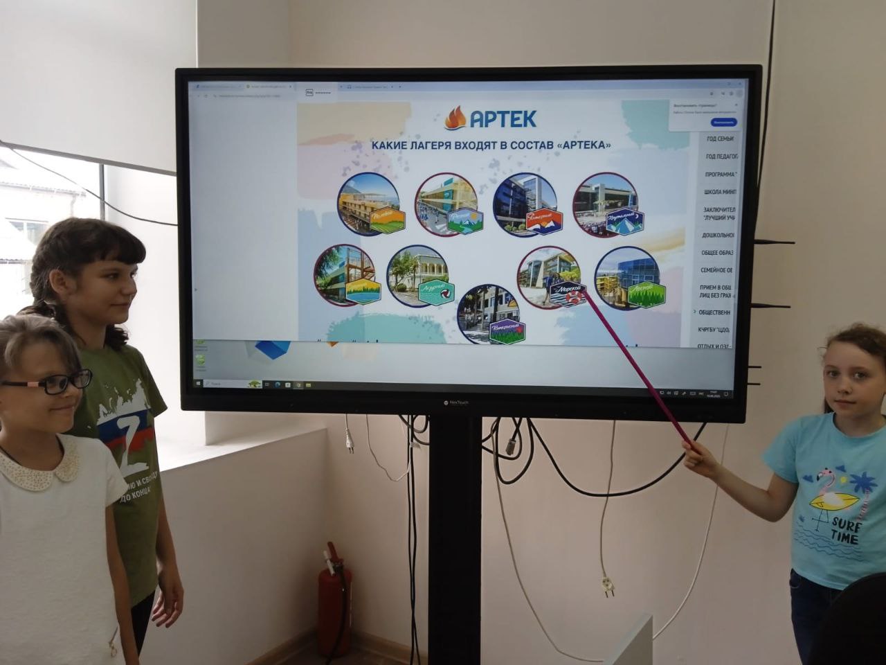 Кадры архивной кинохроники передали атмосферу жизни артековцев от прошлых до современных дней. Карта расположения оздоровительного комплекса, расположенного на крымском побережье Черного моря помогла ребятам ориентироваться среди лагерей Артека. Школьники узнали, что каждый лагерь имеет свои традиции и свой символ. Что бы поближе познакомиться и друг с другом, дети разучили, и с удовольствием поиграли в артековскую игру «Я, ты, он, она, вместе мы одна семья!».