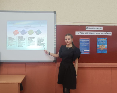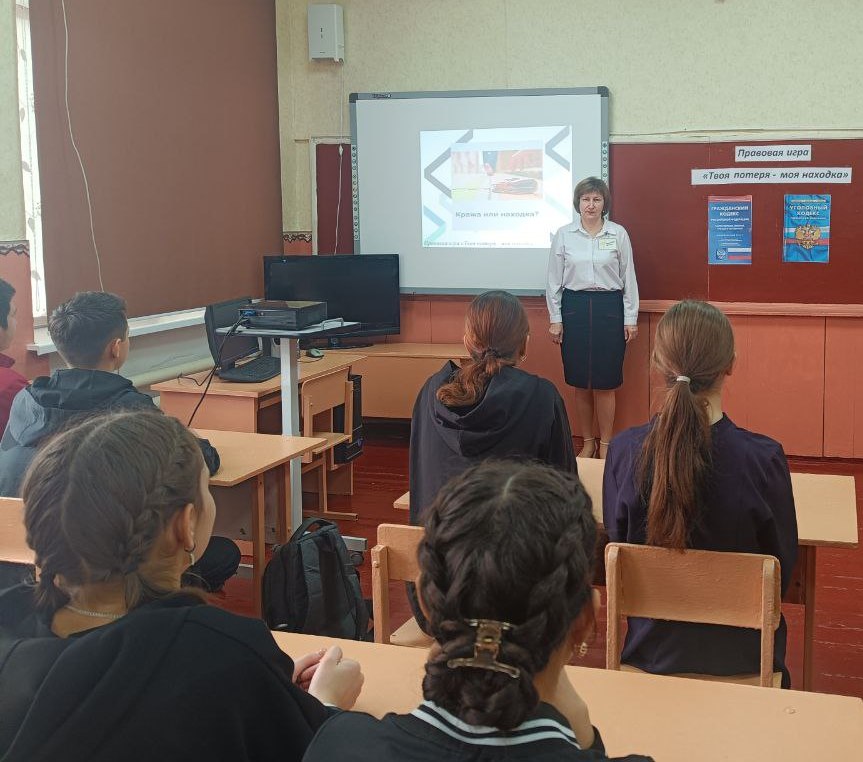 В рамках данного мероприятия советник директора по воспитанию Кремнева А. Н. провела в 9 классе правовую игру «Твоя потеря - моя находка». Педагог в форме ситуационной игры объяснила девятиклассникам, что делать в случае находки предмета (кошелька, телефона, платёжной карты и т.п.). В ходе занятия ребята узнали, как отличается кража и потеря с точки зрения юридической науки.