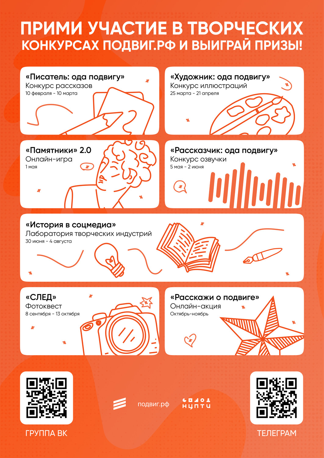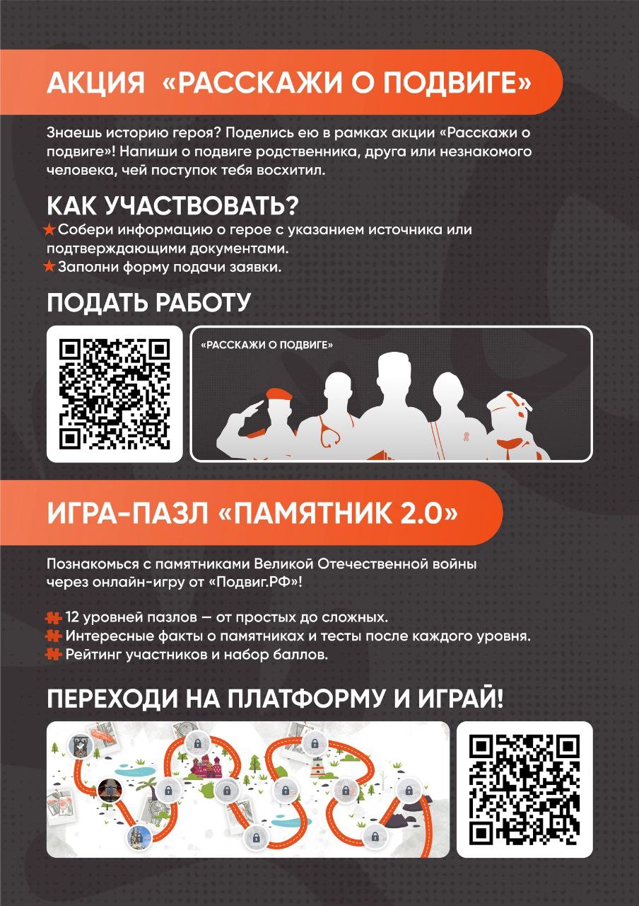 Одна из страниц проекта посвящена художественным рассказам об отваге и самоотверженности защитников Родины в годы Великой Отечественной войны. Все истории прошлого проиллюстрированы, к каждому из них дано описание и QR-код, позволяющий прослушать полную версию рассказа о подвиге героя в годы войны.