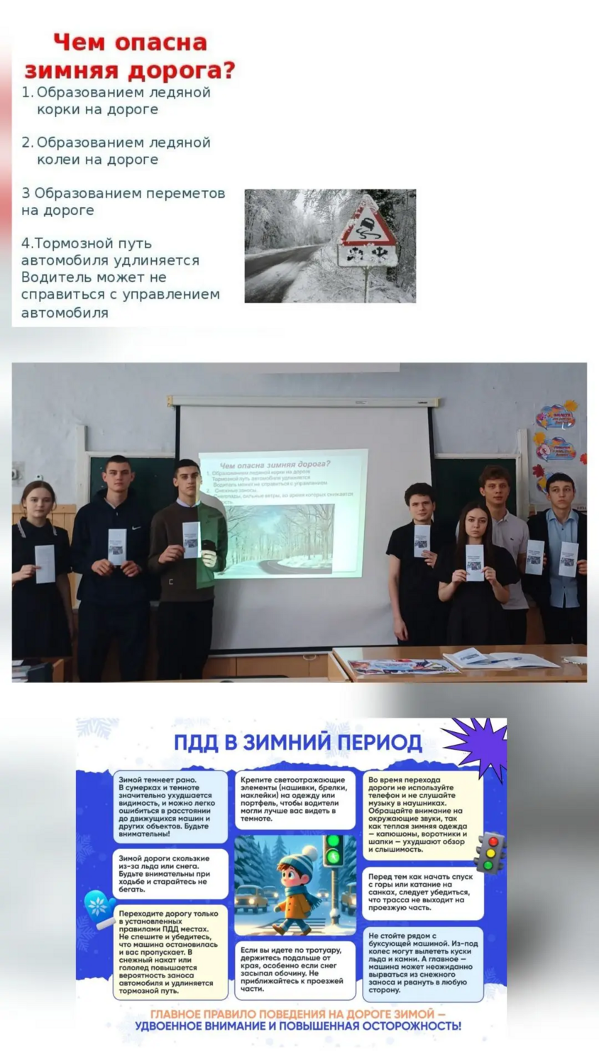 Классный руководитель напомнила ребятам о том, что зимняя дорога опасна и включает ряд особенностей поведения на дороге в зимний период. Десятиклассники повторили правила безопасности на зимней дороге и подготовили для родителей информационные буклеты по соблюдению ПДД.