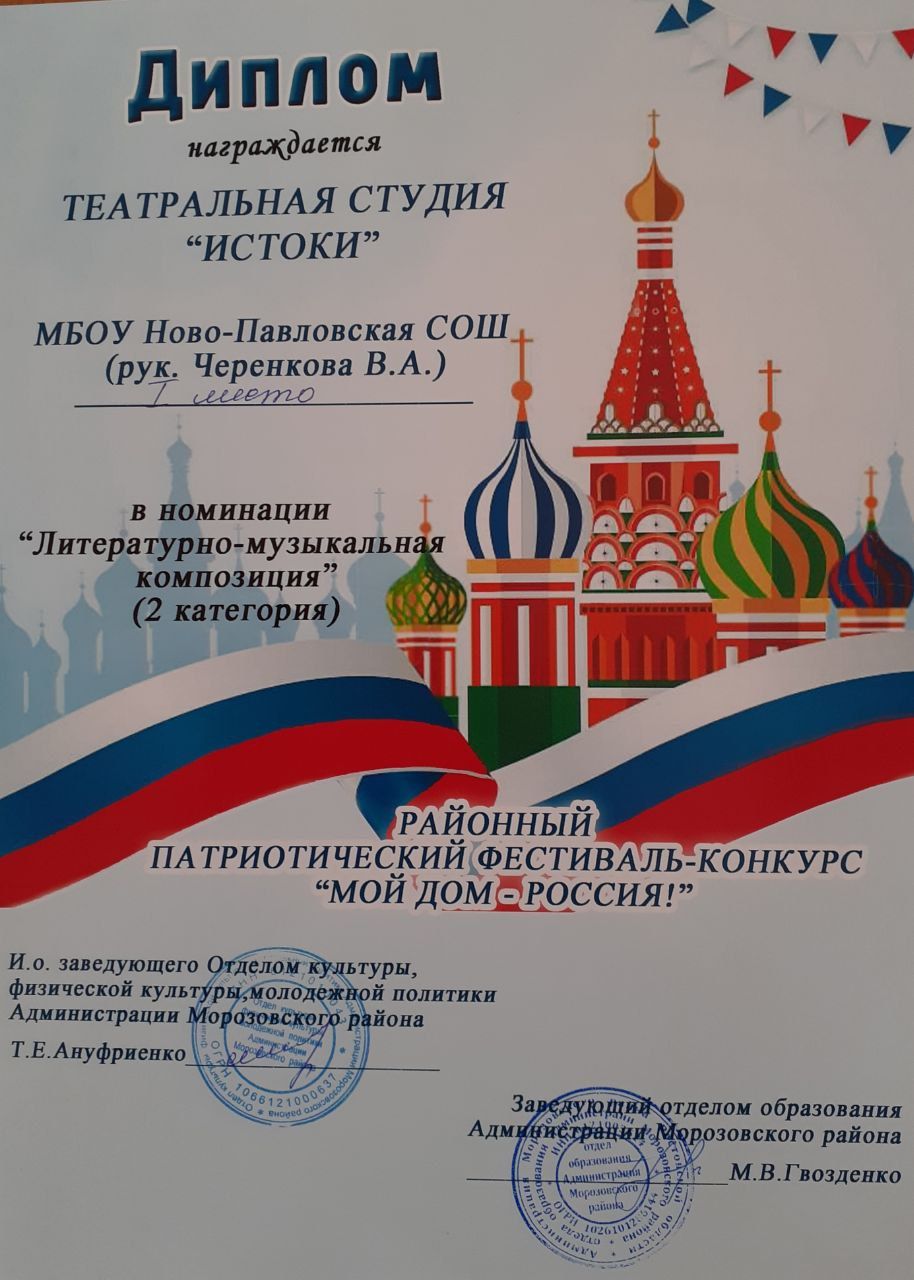 Театральная студия "Истоки" под руководством Черенковой Валентины Анатольевны заняли 1 место в районном патриотическом фестивале "Мой дом-Россия" в номинации: литературно-музыкальная композиция.