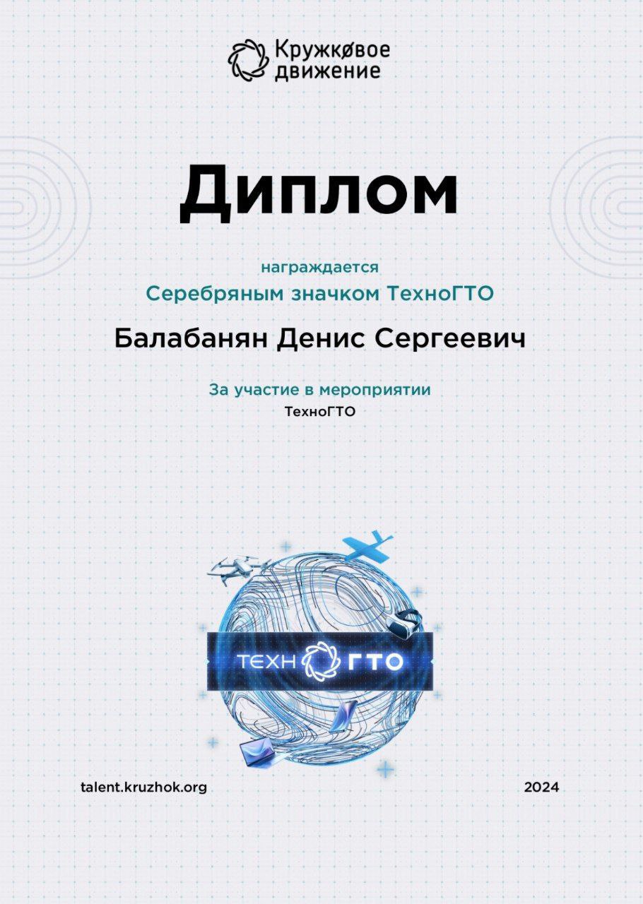 Ученик 6 класса Балабанян Денис стал обладателем серебряного значка ТехноГТО!