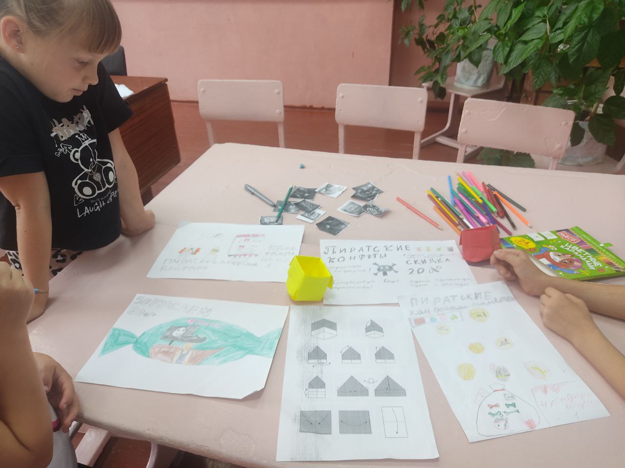 Ребята побывали на станциях "Сундук мертвеца", где сделали коробку в технике оригами; на станции "Дети капитана Флинта" ребята решали экономические задачи; на станции "Пиратский мир" были выбраны карточки с экономным меню и предложены варианты блюд из этих продуктов на день; на станции "Пиратская шляпа" юные орлята придумывали и рисовали рекламу пиратских конфет, придумывали слоган и убеждали ведущего их купить.
