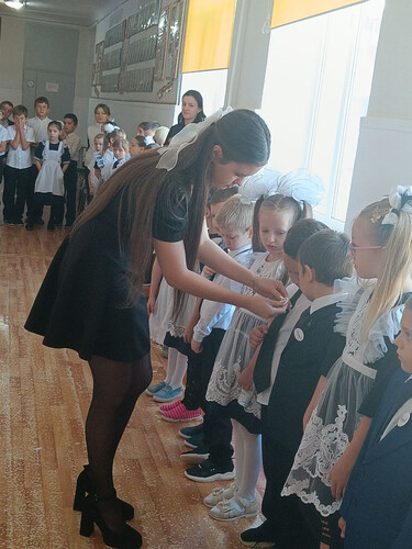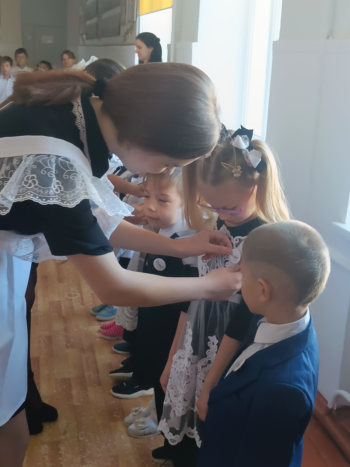 Активисты "Движения Первых", ученики 10 класса, вручили первоклассникам значки, как символ принадлежности к содружеству «Орлят России».