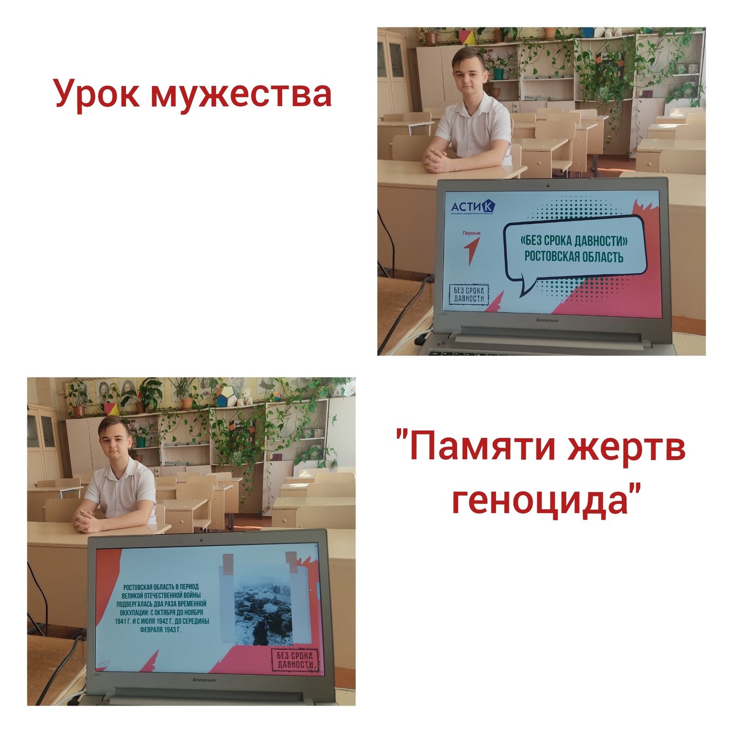 В классном коллективе 10 класса прошел урок мужества «Памяти жертв геноцида», на котором шел серьёзный разговор о необходимости сохранения памяти об ужасах войны, о понятии «геноцид» и ответственности за преступление по статье «геноцид» в национальном и международном праве. На встрече узнали о зверствах нацистов в Ростовской области, о мемориале жертвам фашизма в «Змиёвской балке».