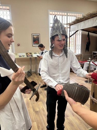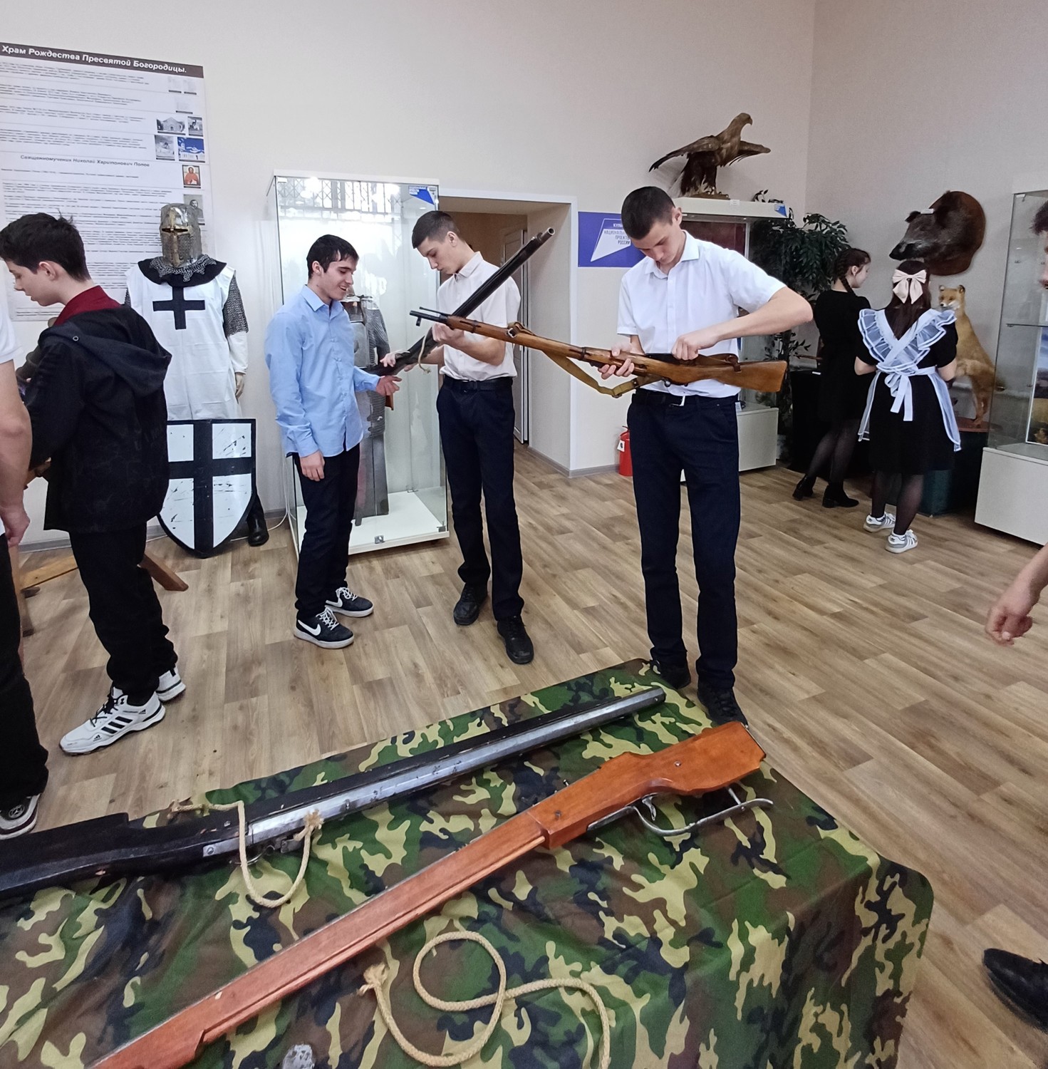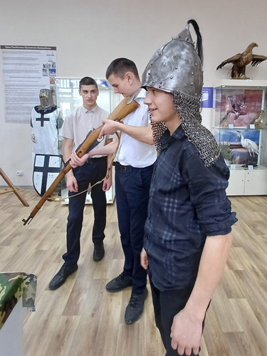 Школьникам рассказали о том, как на протяжении веков менялась одежда, оружие, обмундирование воинов X - XVII веков. Ребята с интересом рассматривали предметы и фотографировались на память.