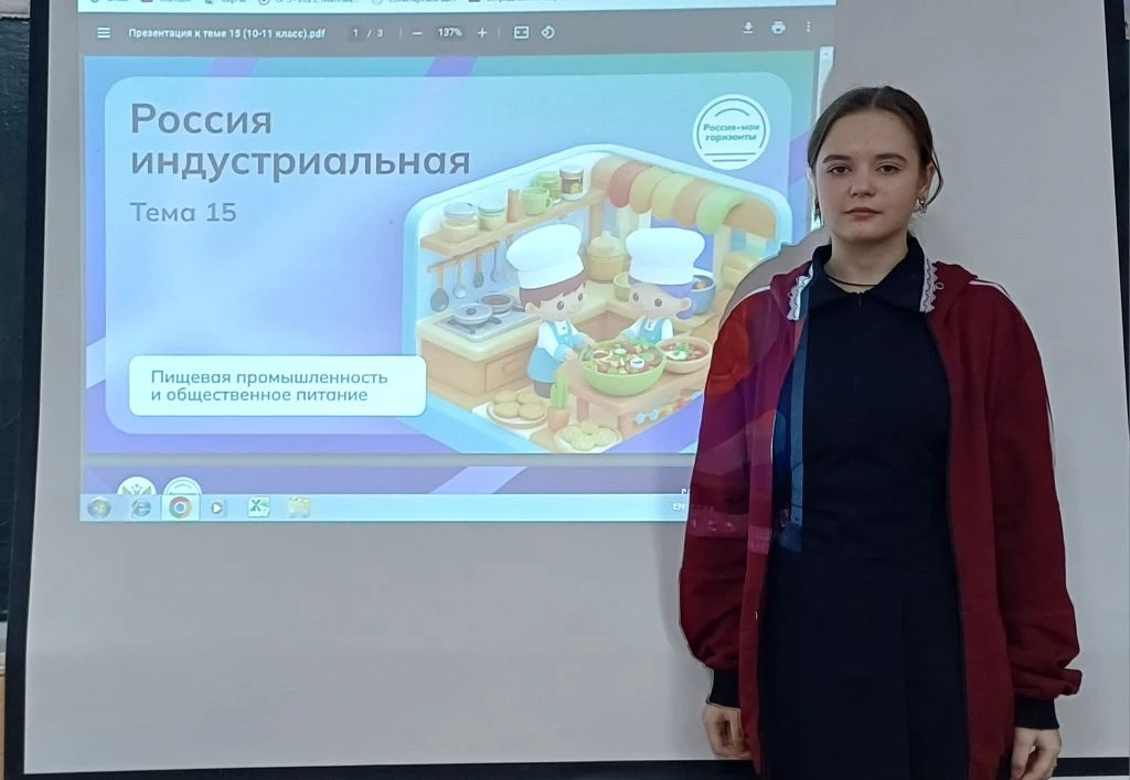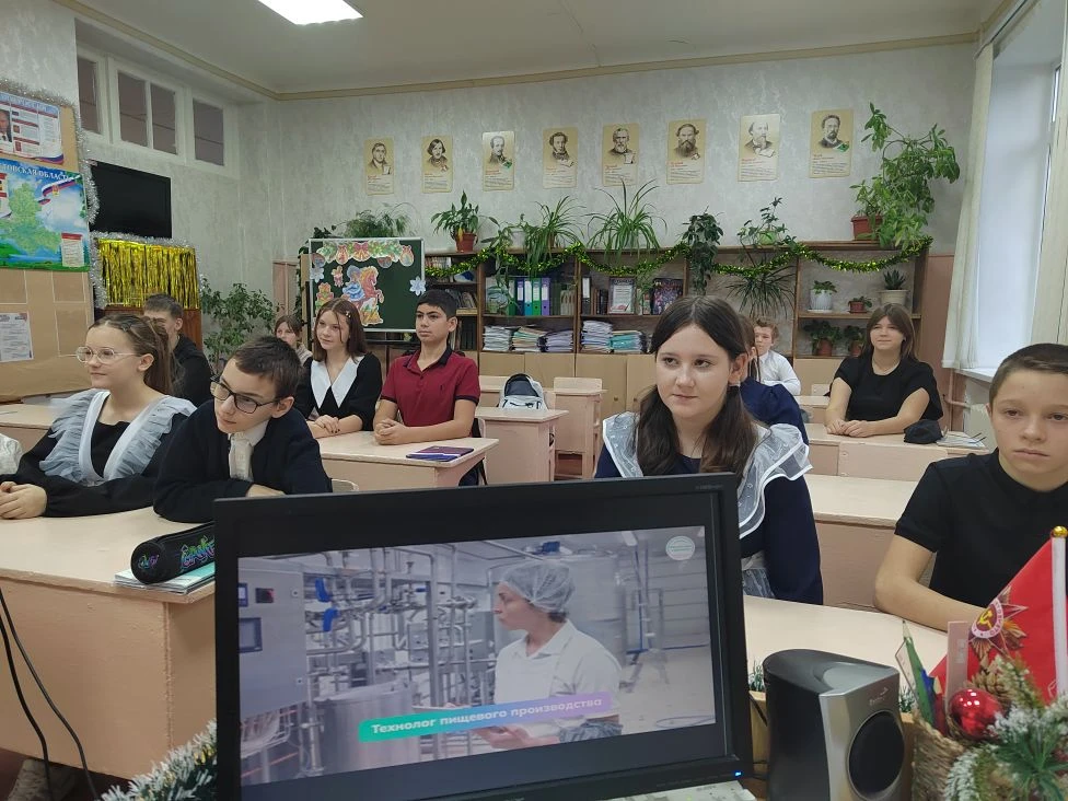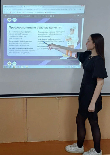 На занятиях ученики познакомились с пищевой промышленностью. Сегодня пищевая промышленность – это высокотехнологичная сфера, которая включает в себя различные подотрасли, такие как мясная, молочная, рыбная, хлебопекарная, масложировая, макаронная, кондитерская и многие другие. Школьники говорили и об общественном питании. Ребята увидели, как можно реализовать себя в этой области, познакомились с некоторыми актуальными профессиями и вариантами получения образования, а также посмотрели познавательные видеоролики, поработали с интеллект-картой профессий пищевой промышленности.