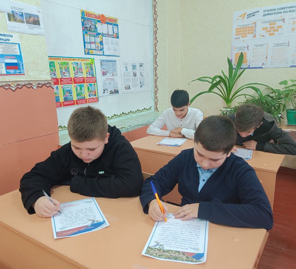 Ново-Павловская школа участвует в реализации национального проекта "Молодёжь и дети". Ученики 7 класса приняли участие во Всероссийской акции «Письмо солдату». Ребята написали письма солдатам специальной военной операции. В своих письмах дети поблагодарили солдат за отвагу, за смелость и мужество, пожелали скорейшего возвращения домой. Семиклассники верят в то, что благодаря нашим защитникам наступит МИР.